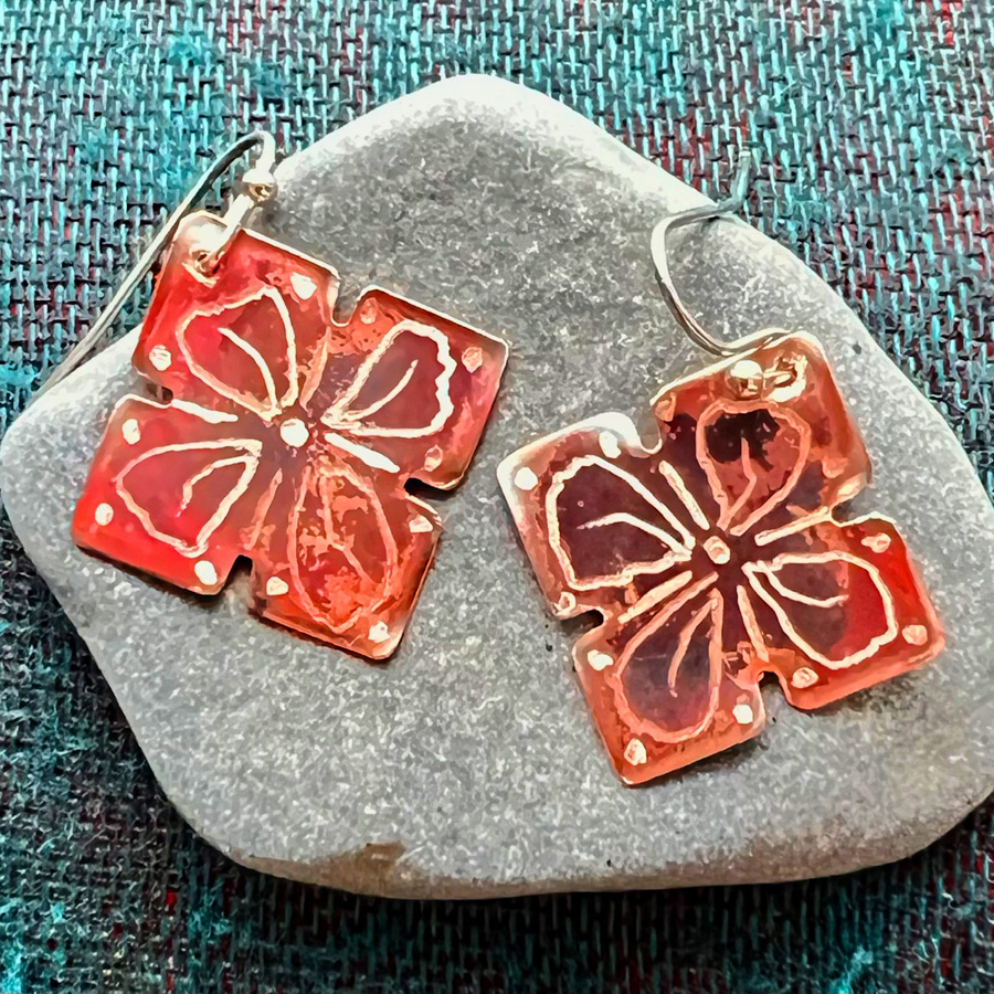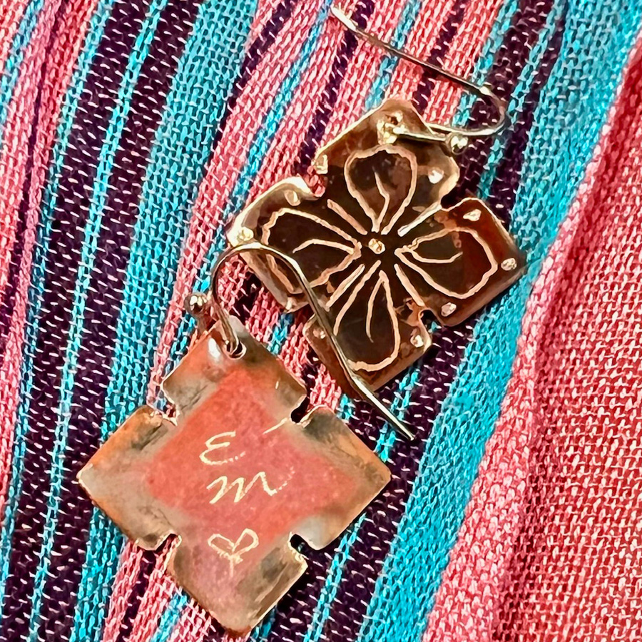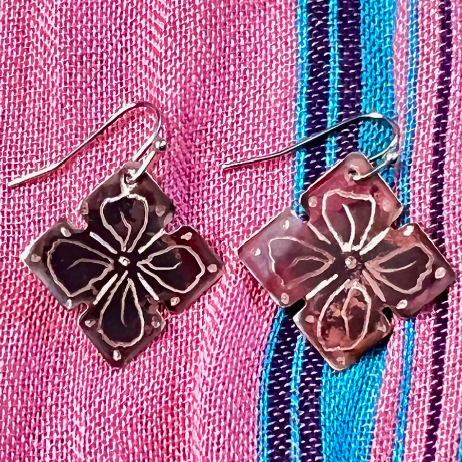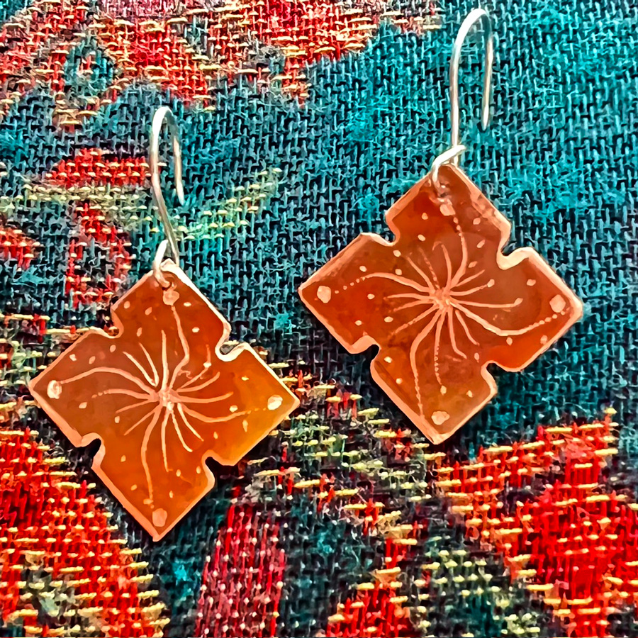 These beauties are detailed with intricate patterned designs and hang from sterling silver ear wires. No pair is the same. Please indicate desired shape (Diamond, Flower or Teardrop).