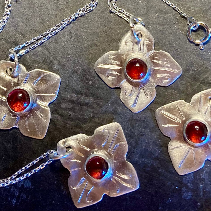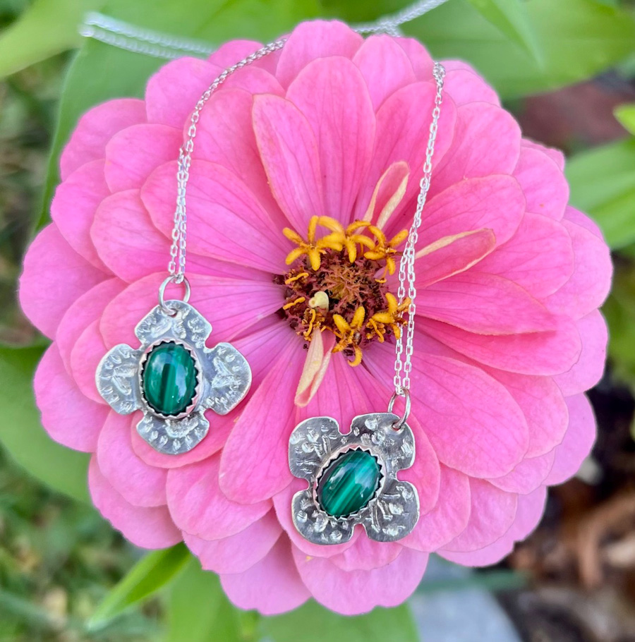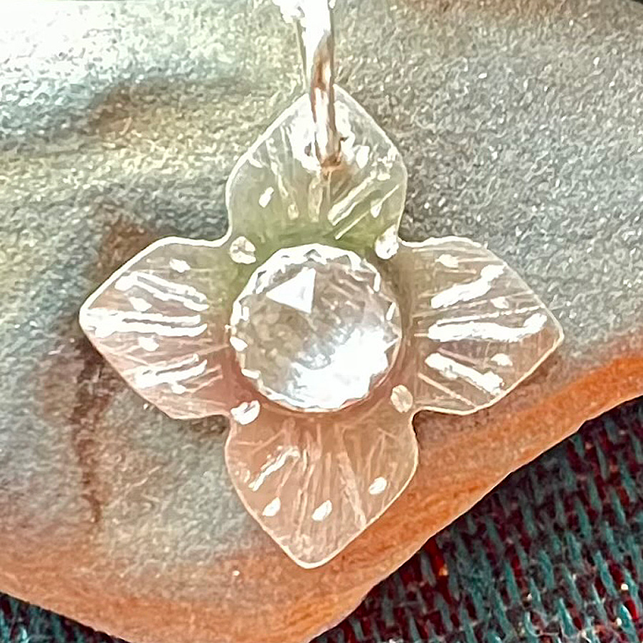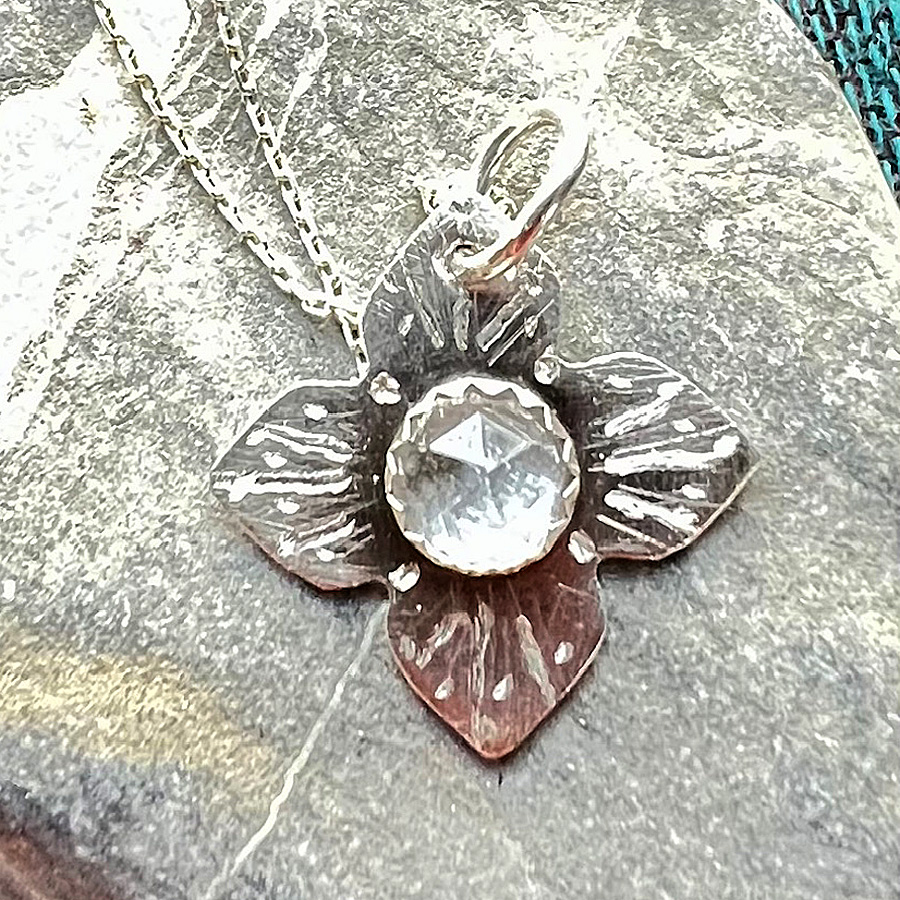 Hand cut and detailed flower hangs from a 16” dainty chain. In the center sits a small semi-precious white topaz stone. Can be custom made with preferred stone. (some limitations apply)